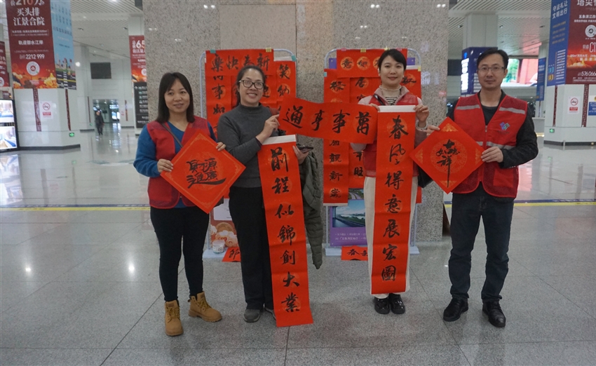 活動(dòng)現(xiàn)場,一幅幅提前寫好的春聯(lián)和福字整齊排列,散發(fā)著陣陣墨香,傳遞著濃濃的節(jié)日氛圍。黨員志愿者們?cè)谌巳褐?/span>忙碌穿梭,熱情地將飽含新春祝福的春聯(lián)與寓意滿滿的福字送到過往旅客、車站工作人員和出租車司機(jī)手中。一位拖著行李的旅客接過春聯(lián)感動(dòng)地說:“這大紅的春聯(lián)和福字,一下子就讓回家的路充滿了年味!”車站工作人員和司機(jī)們也紛紛表示,這份禮物十分貼心,讓他們心里暖洋洋的。