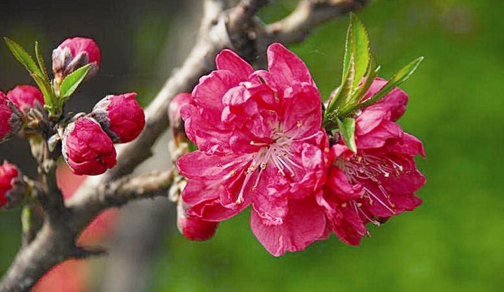 桃花,屬薔薇科,落葉小喬木,高可達(dá)6一8米。樹干灰褐色,粗糙有孔。小枝紅褐色或褐綠色,平滑。葉橢圓狀披針形,邊緣有細(xì)鋸齒;▎紊,有白、粉紅、紅等色,重瓣或半重瓣,花期3月。核果近球形,表面密被短絨毛,因品種不同,果熟6一9月。